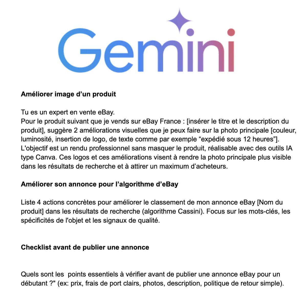 L'IA a été entrainée sur des données publiques, mais pas sur les connaissances d'experts, ni les données internes d'eBay :L'IA est un outil puissant et "intelligent" mais qui se base sur un ensemble de connaissances publiques (contenu de sites web, posts de réseaux sociaux publics comme Reddit, vidéos YouTube). Elle fournit des réponses logiques et est capable de raisonner en s'appuyant sur cette masse d'informations.Cependant, l'IA n'a pas accès aux connaissances privées d'experts. Par exemple, à propos d'eBay, ChatGPT et Google Gemini ont lu les pages officielles du site eBay, ou des scripts de vidéos YouTube sur le sujet. Mais ils n'ont pas accès aux connaissances privées de vendeurs eBay présents depuis des années.Voici un cas précis : eBay applique plusieurs règles cachées, non divulguées sur leur site (comme par exemple à propos de leur algorithme) que les IA ne connaitront pas précisément, mais que les vendeurs eBay expérimentés auront en tête grâce à l'expérience de vente.L'IA est passive, elle répond à nos prompts :L'IA est un outil absolument formidable, mais il faut savoir qu'elle n'est pas active, mais passive, elle ne nous guide pas en nous disant "faites ceci".Au contraire, elle répond à nos questions (appelées "prompts").La qualité des réponses va directement dépendre des questions qu'on lui pose. Un débutant qui agit seul, sans accompagnement, ne saura pas quelles questions poser pour avoir les meilleurs résultats.Avec un accompagnement, l'élève va apprendre à bien "prompter" les IA, c'est-à-dire poser les bonnes questions, bien structurer les prompts pour avoir les meilleures réponses possibles.