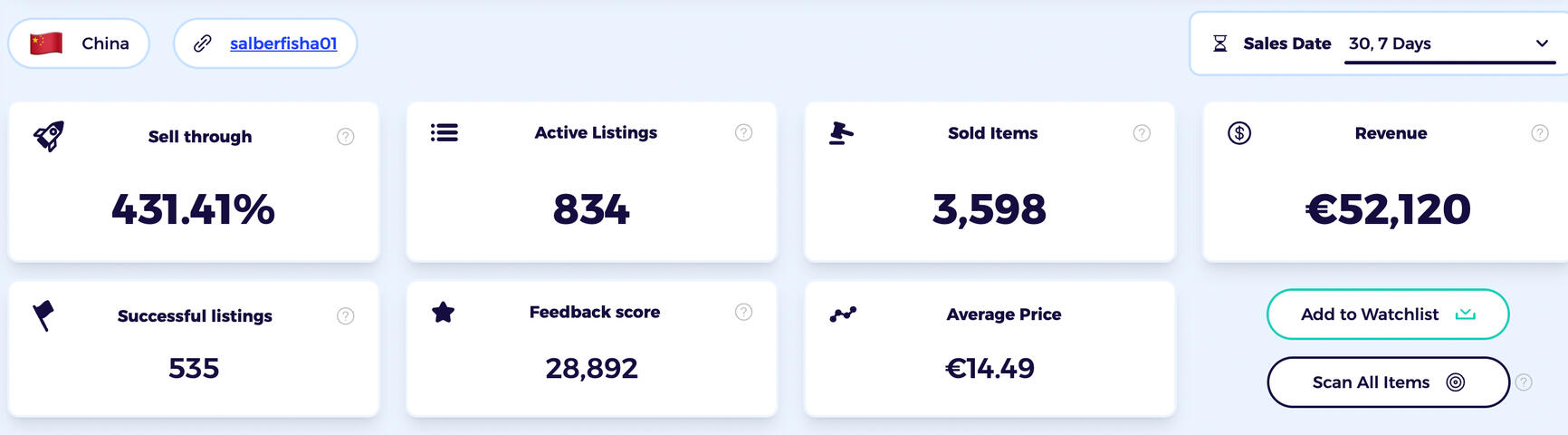 Cette autre boutique, basée en Chine mais qui vend exclusivement en Allemagne, génère 52 120€ par mois (soit environ 10 000€ de profit) en revendant des produits Aliexpress sur eBay Allemagne.